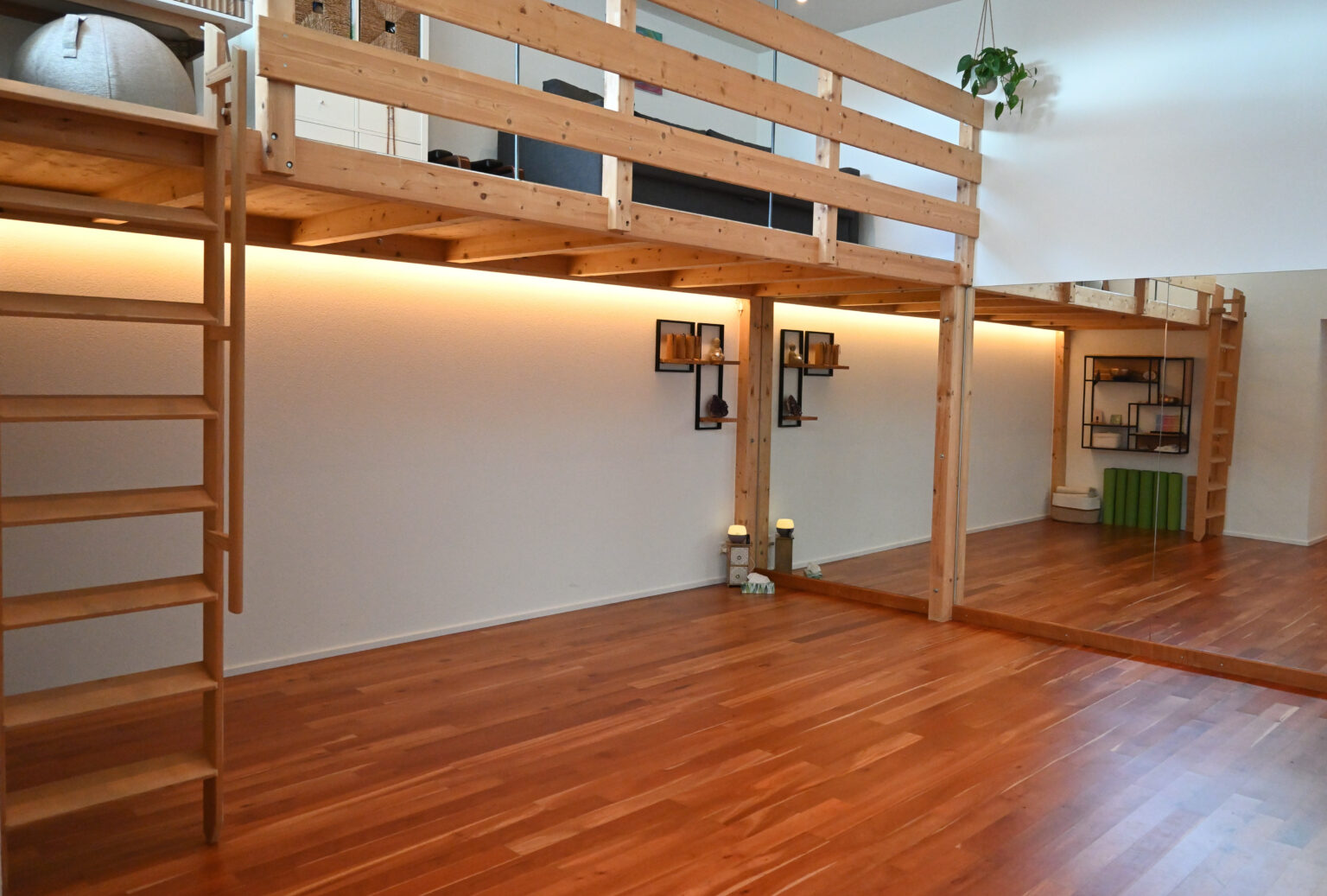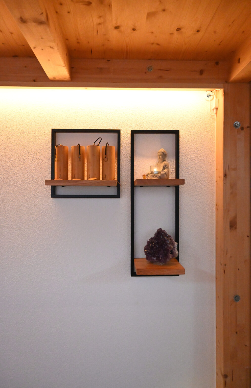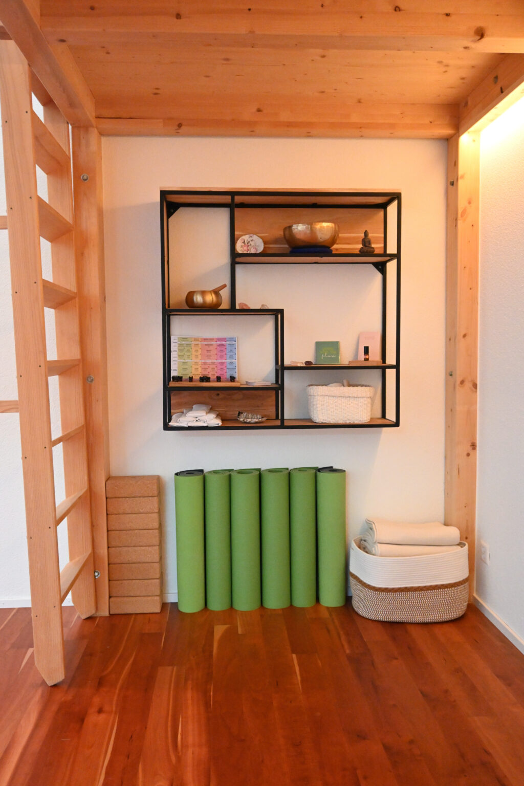 In meinem liebevoll gestalteten Yogaraum findest du alles, was du für eine achtsame Yogastunde brauchst: Matten, Blöcke und Decken sind vorhanden, ebenso eine kleine Garderobe und ein Badezimmer.